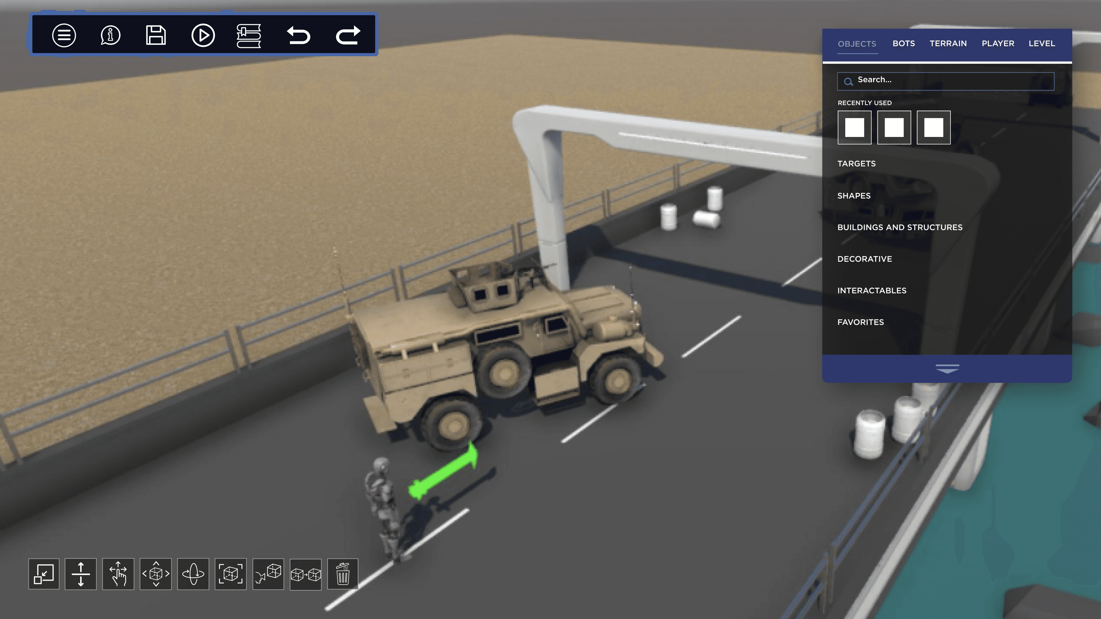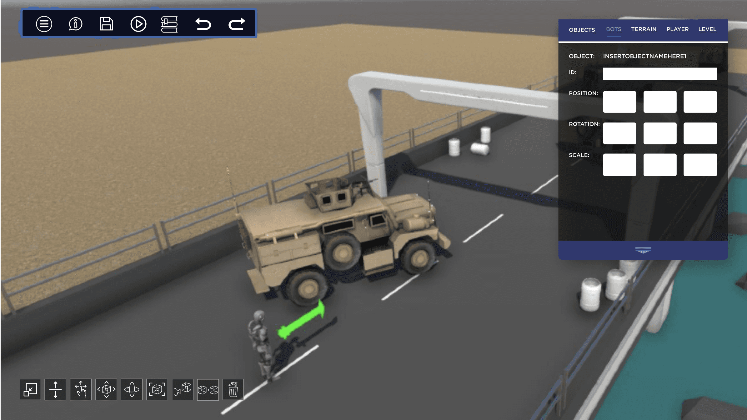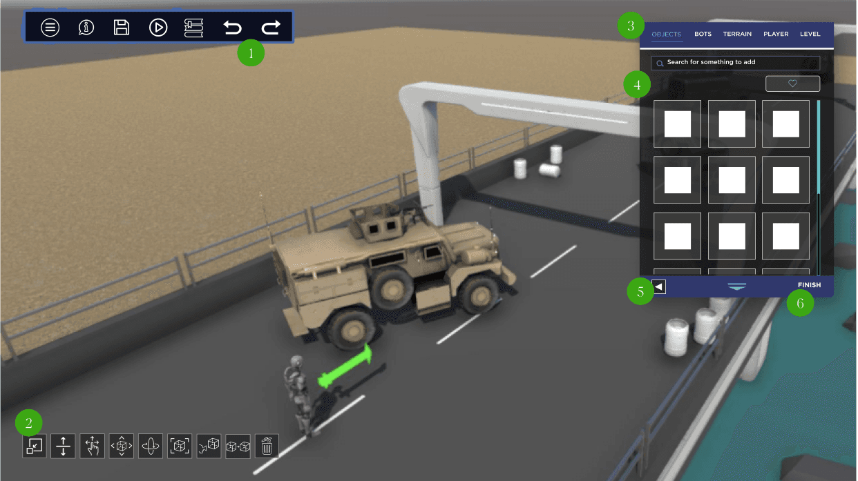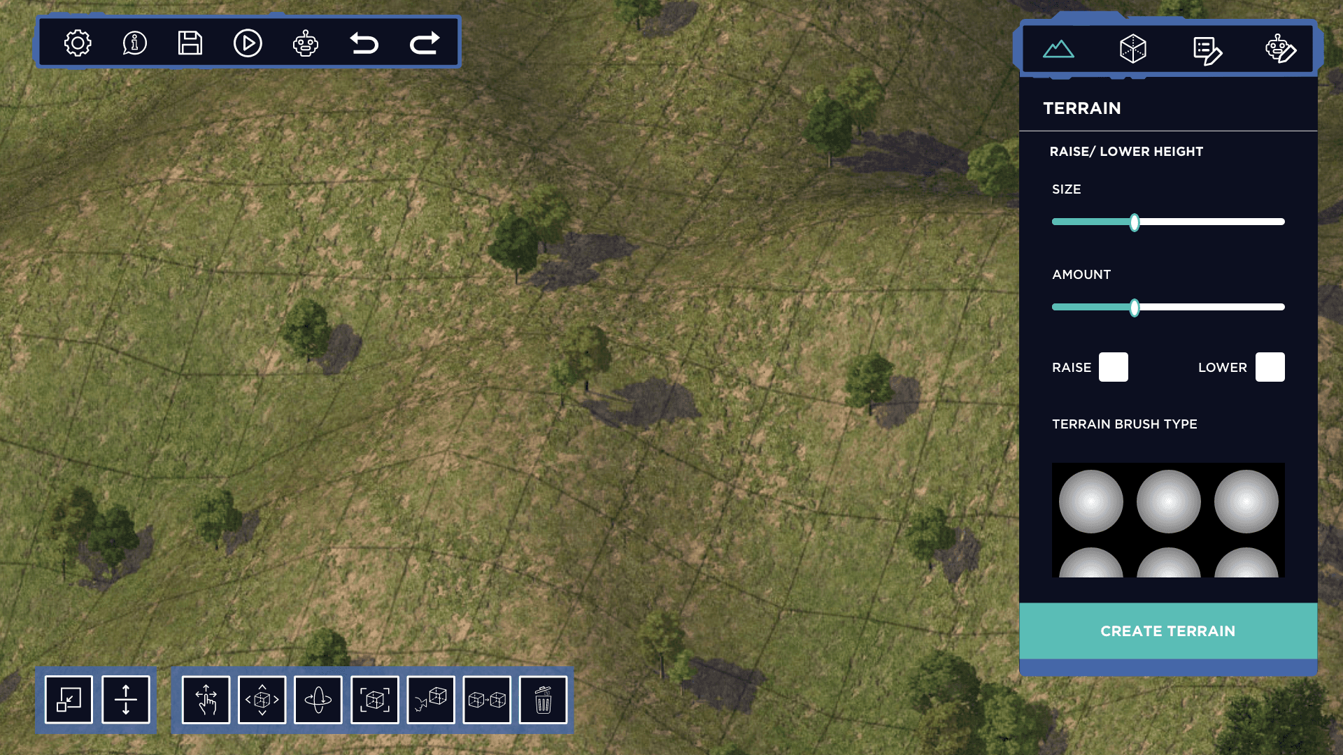Where the player can access, objects to place within the field, bots, edit the terrain, edit the players avatar, and edit the level settings.
