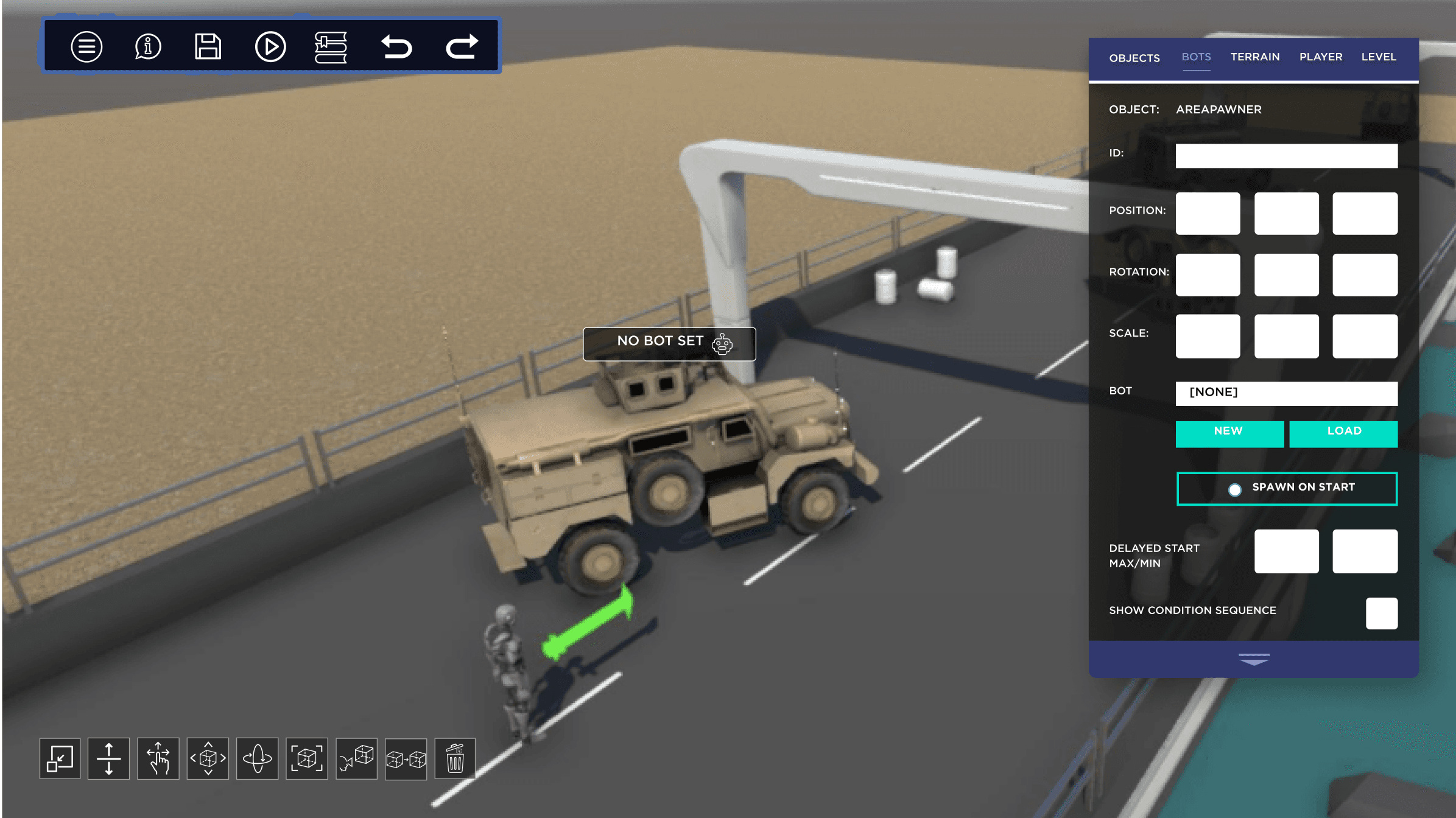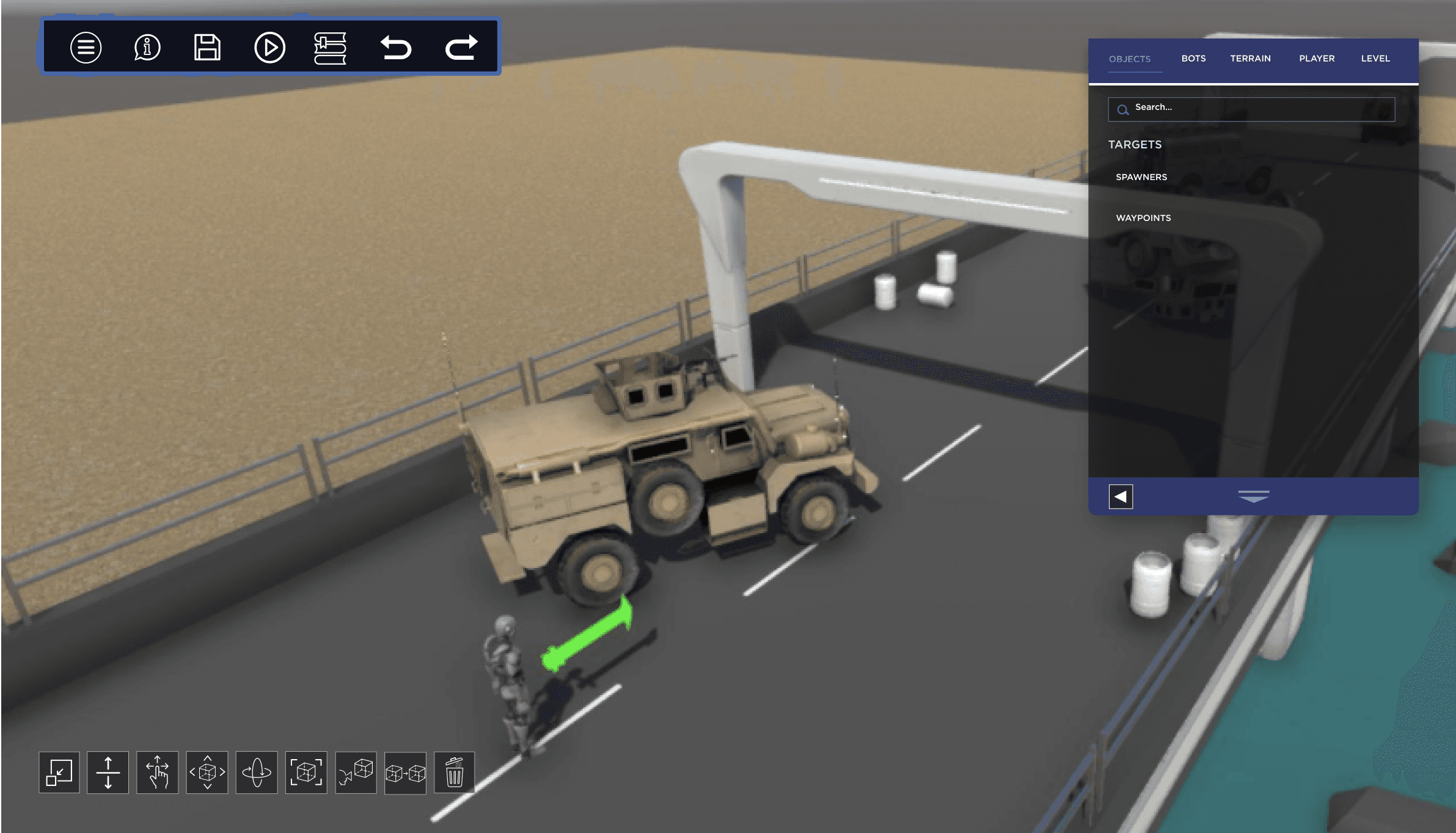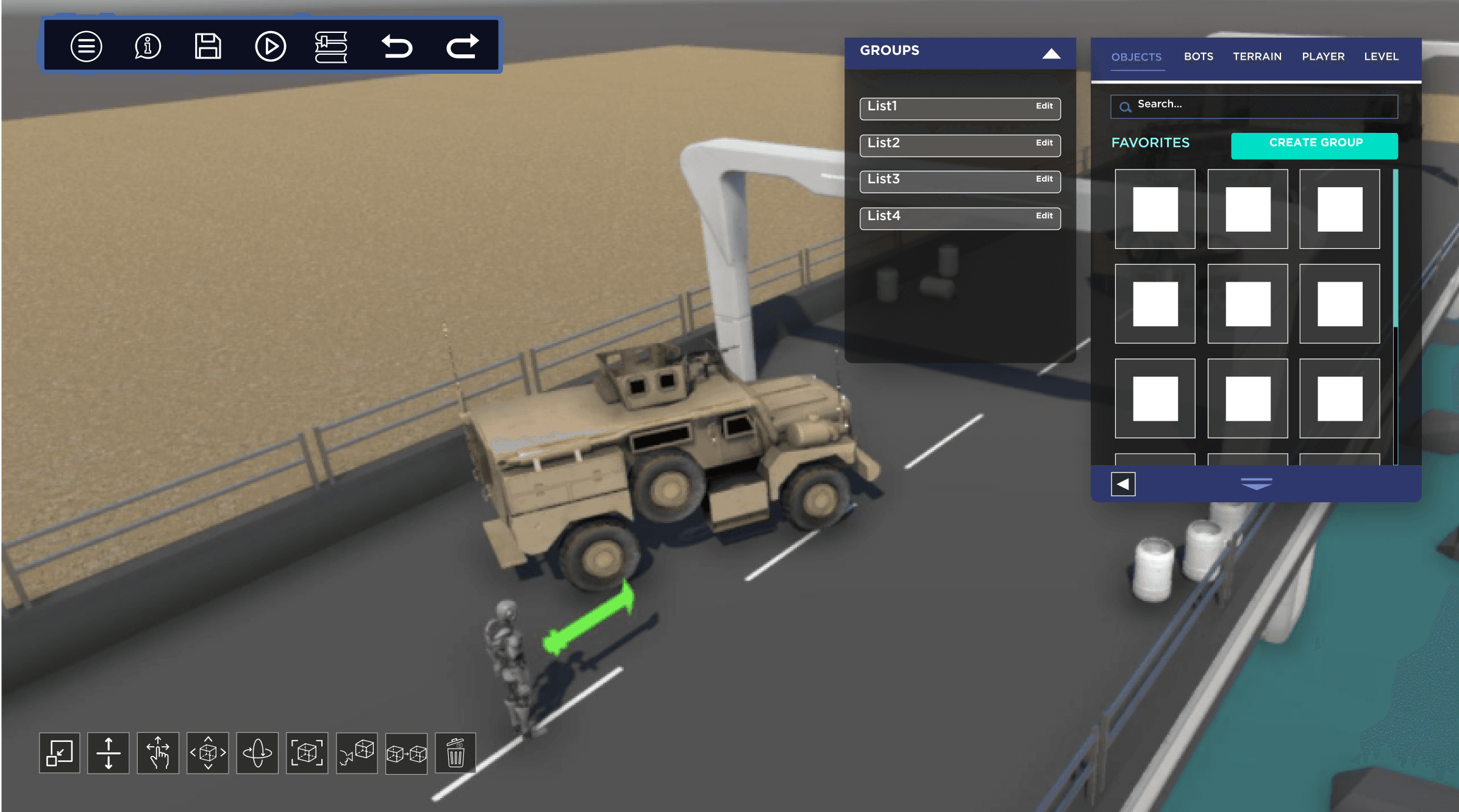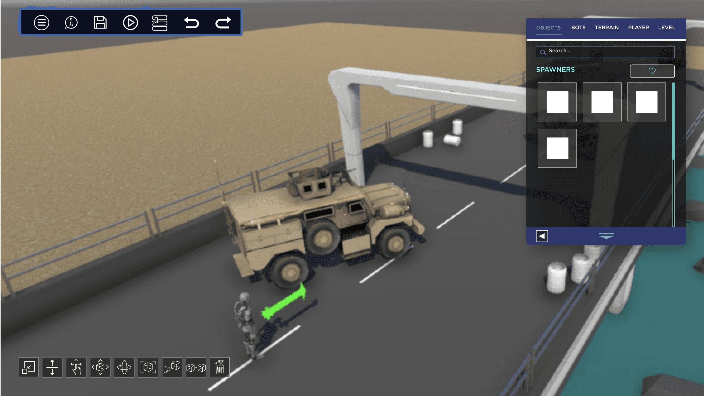 Where the player can access, objects to place within the field, bots, edit the terrain, edit the players avatar, and edit the level settings.