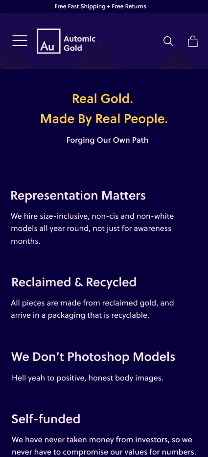 Automic Gold is perceived as a quality jewelry brand that values inclusivity and sustainability. Respondents associated the brand with qualities such as being queer-owned, offering unique products, and being a small business. However, the brand's main commitment to ethical sourcing and inclusivity was not so easily recognizable.