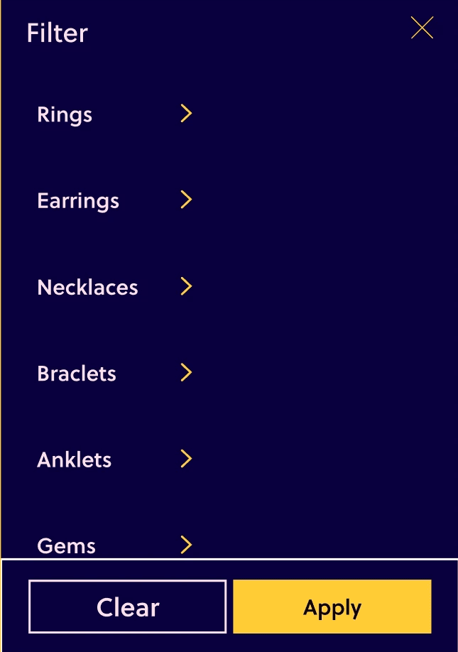 In the original filter system, there was no back button, nor a way for users to be specific about what they wanted to find. Once on a page of necklaces featuring rubies, there was no way to go back to change their mind. They would have to go to the hamburger drop down and begin the process again.